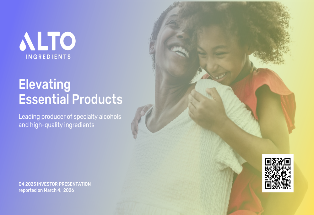 Alto Ingredients, Inc. produces, distributes, and markets specialty alcohols, renewable fuel, and essential ingredients in the United States. The company operates in three segments: Marketing and Distribution, Pekin Campus Production, and Western Production. It offers specialty alcohols used in mouthwash, cosmetics, pharmaceuticals, hand sanitizers, disinfectants, and cleaners for health, home, and beauty markets; grain neutral spirits used in alcoholic beverages and vinegar, as well as corn germ used in corn oils in the food and beverage markets; alcohols and other products for paint applications and fertilizers in the industrial and agriculture markets; and essential ingredients, including dried yeast, corn protein meal, corn protein feed, corn germ, distillers grains, and liquid feed for commercial animal feed and pet food applications, as well as yeast and gas liquid CO2 for human consumption. The company also provides fuel-grade ethanol used as transportation fuel additives and distillers corn oil used as a renewable diesel and biodiesel feedstock, as well as fuel-grade ethanol produced by third parties. In addition, it offers transportation, storage, and delivery services through third-party service providers. Further, the company operates alcohol production facilities. It sells ethanol to integrated oil companies and gasoline marketers; essential ingredient feed products to dairies and feedlots; and corn oil to poultry, renewable diesel, and biodiesel customers. The company was formerly known as Pacific Ethanol, Inc. and changed its name to Alto Ingredients, Inc. in January 2021. Alto Ingredients, Inc. was founded in 2003 and is headquartered in Pekin, Illinois.